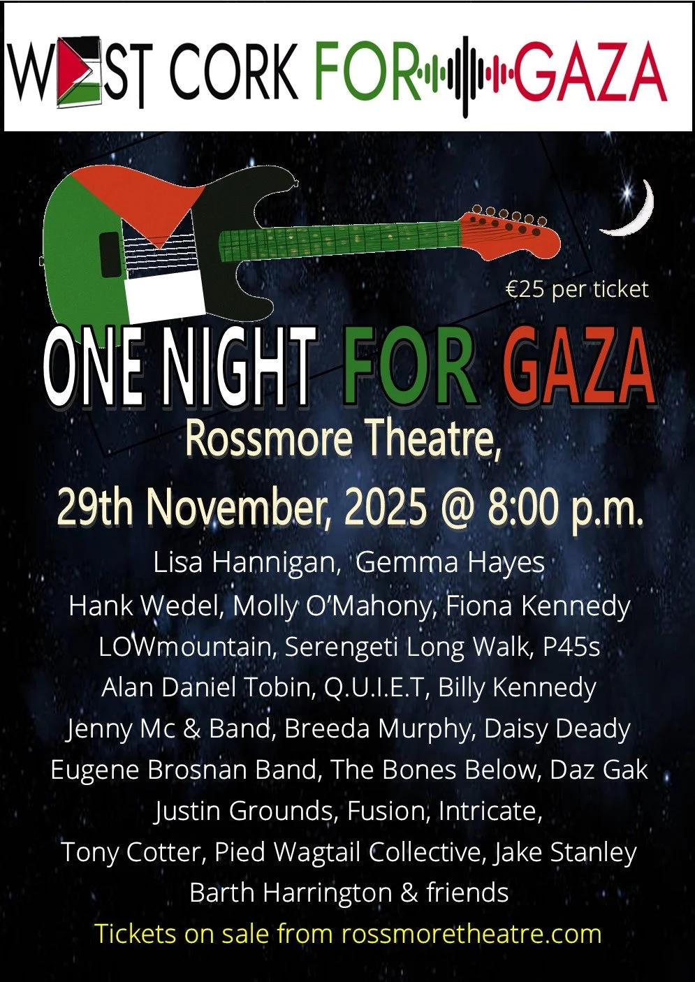 A big show with all the musical community from West Cork, raising funds for the people of Gaza. Tickets selling fast!